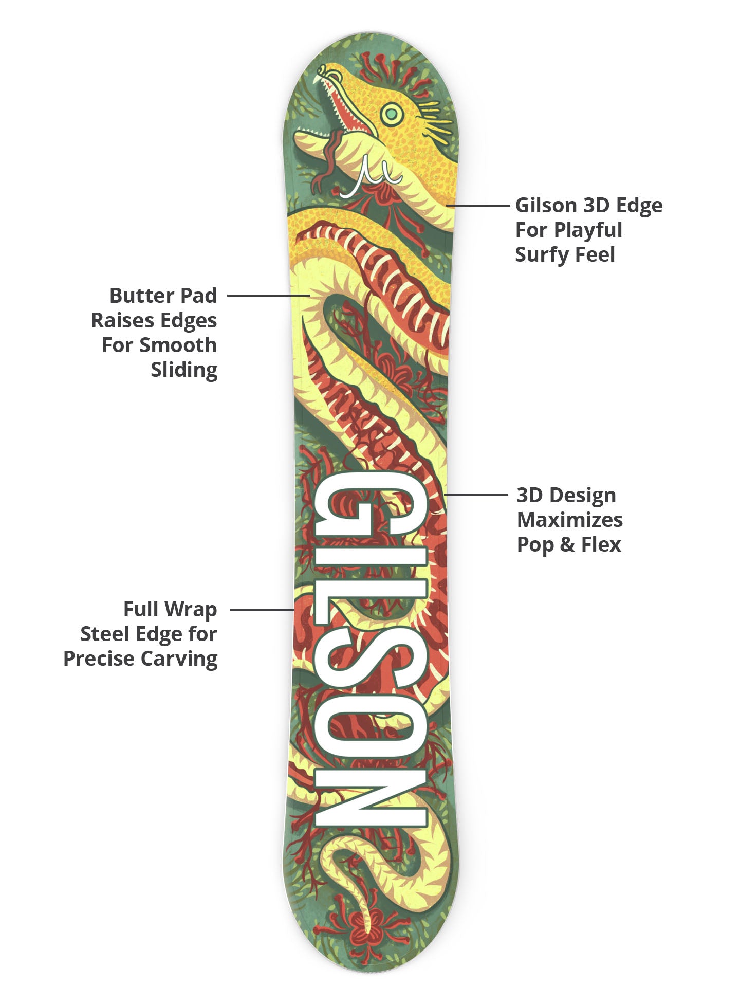 - Surfy, Forgiving Feel – The hybrid camber with GILSON's butter pad and edge design delivers smooth, surfy turns while staying catch-free and playful.